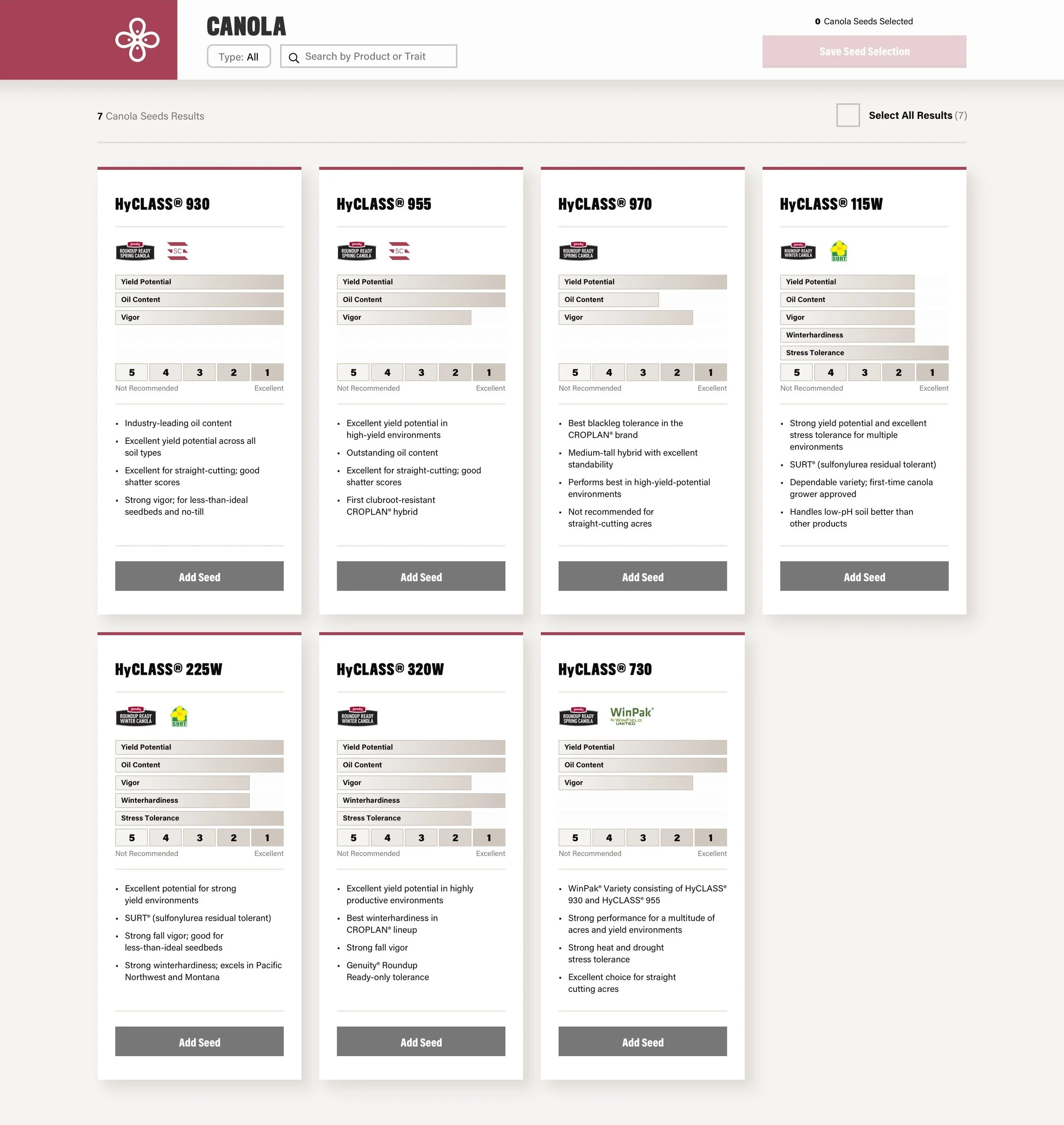 Using CROPLAN’s existing iconography, styles from an in-progress update of the entire Winfield United brand and cues from past printed seed guides, we created a simple and straightforward tool that felt familiar to users.